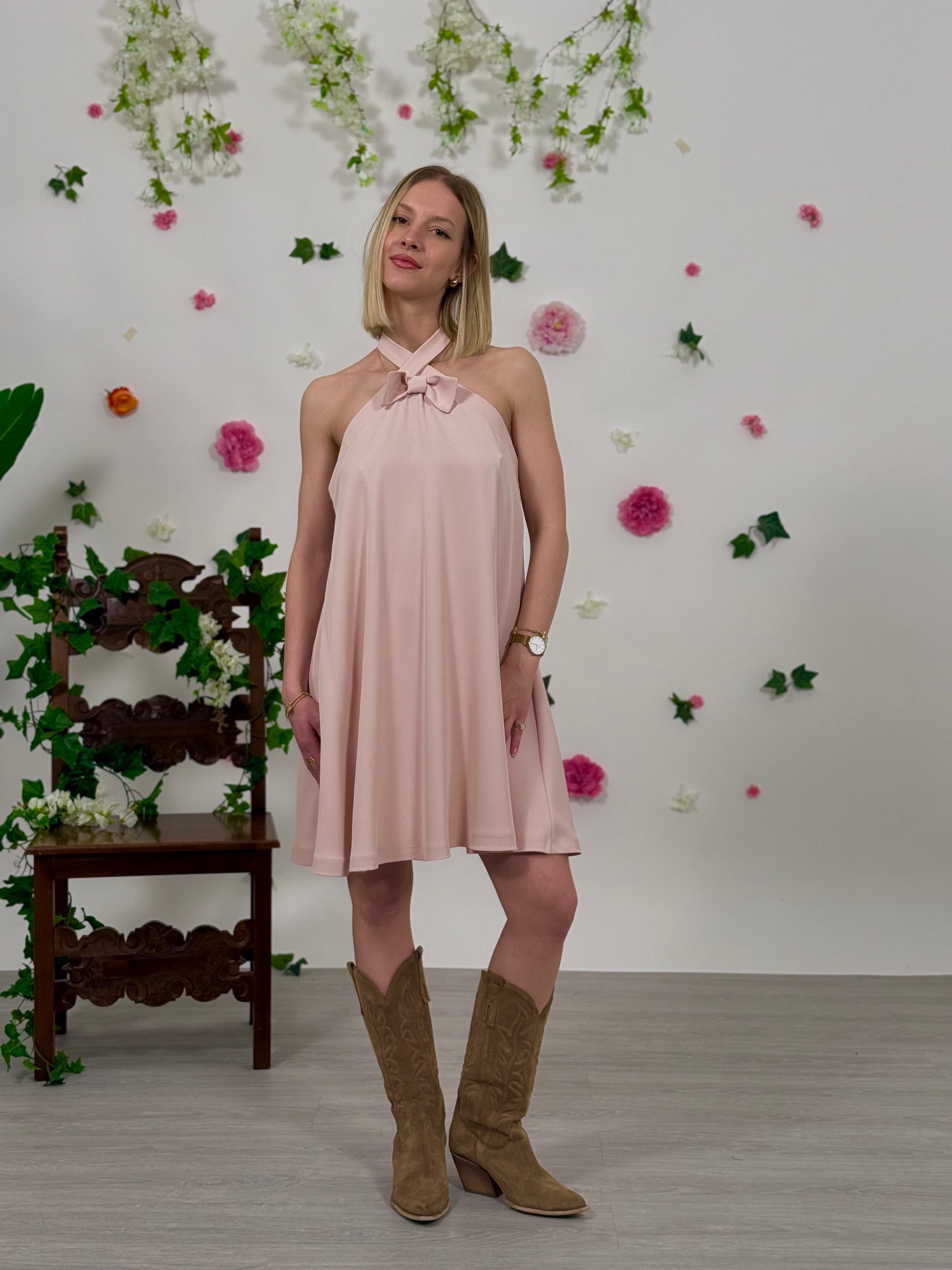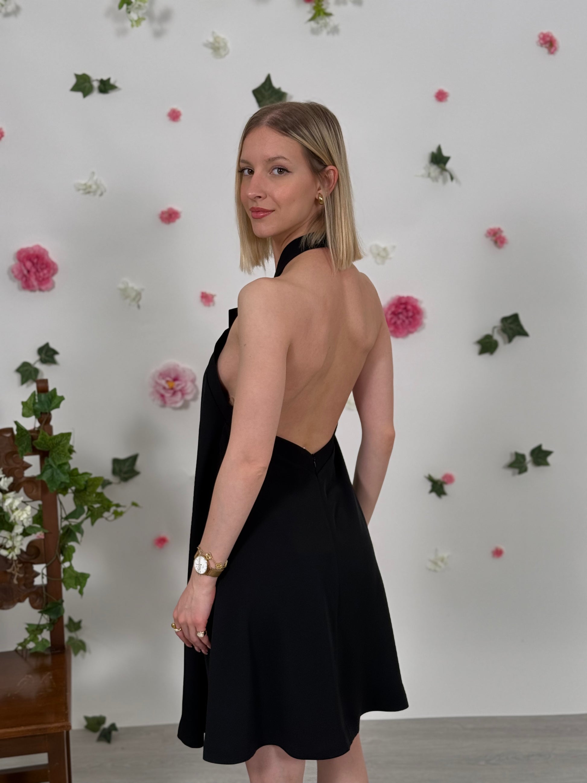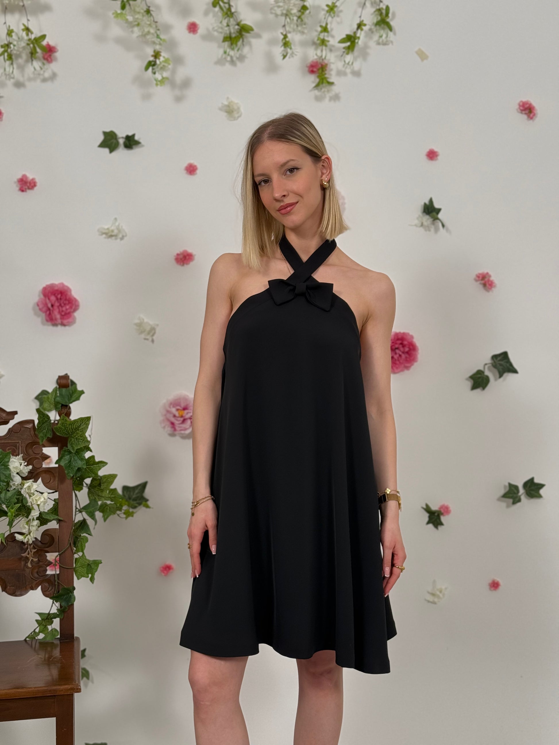 Abito allacciato al collo con fiocco e schiena scoperta. Chiusura con zip sul retro.