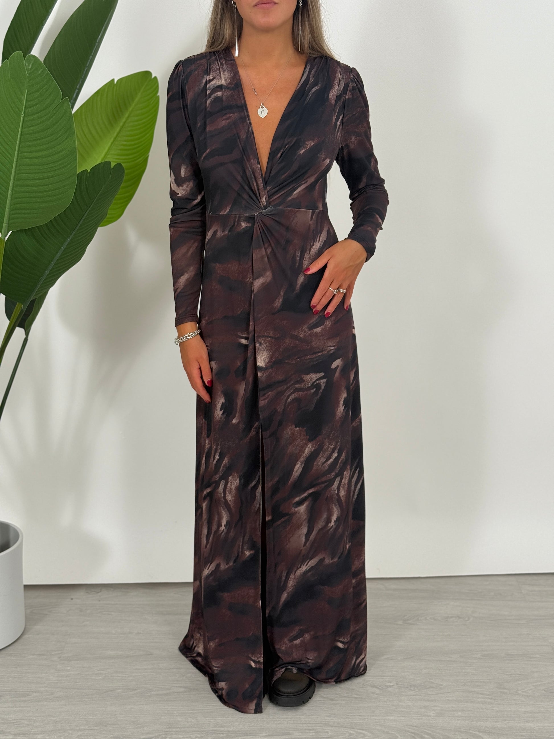 Abito scollo V a fantasia, manica lunga con spallina imbottita e spacco sul davanti.