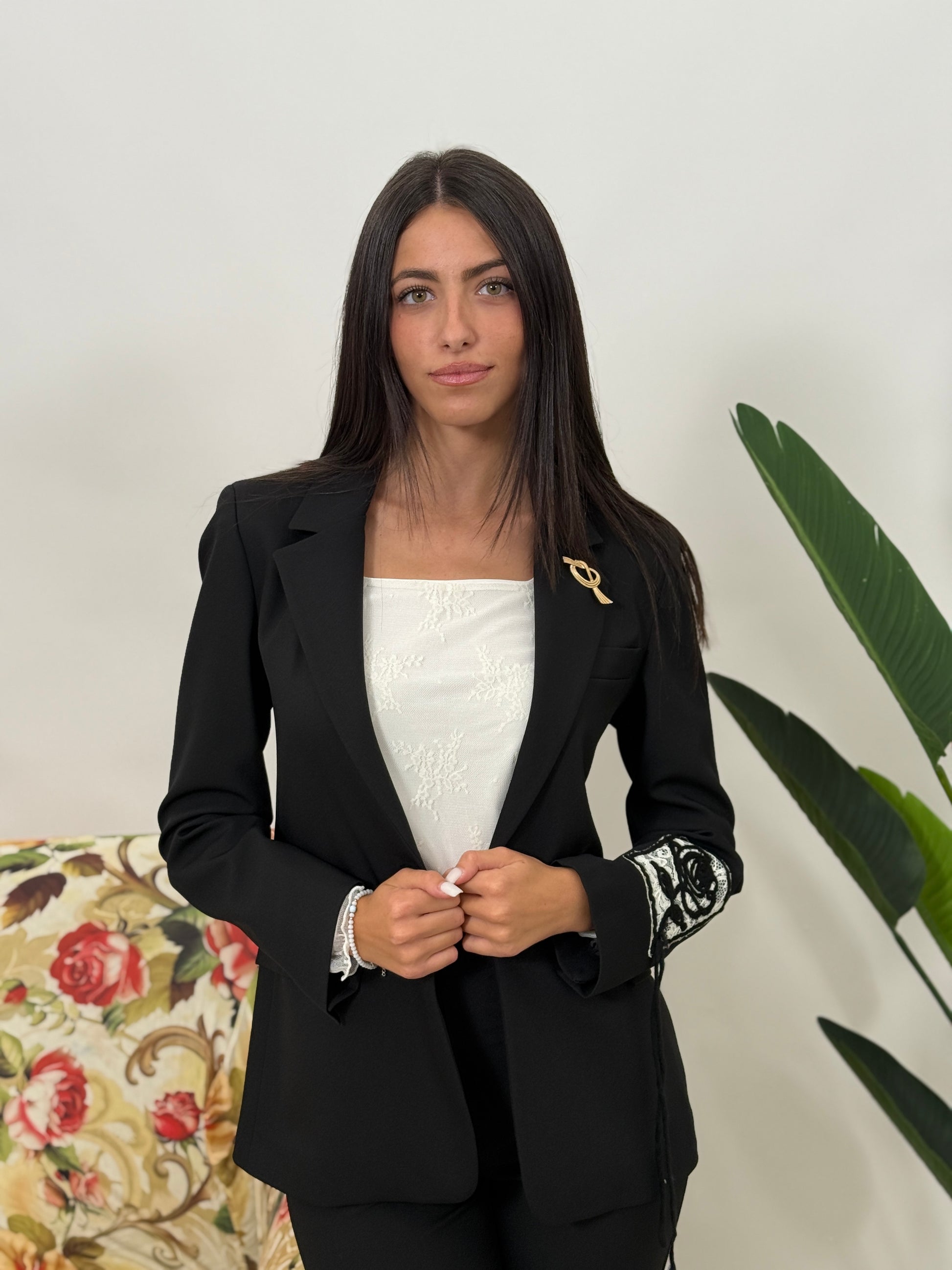 Blazer dritto monopetto con ricamo sulla manica e spilla sul collo revers