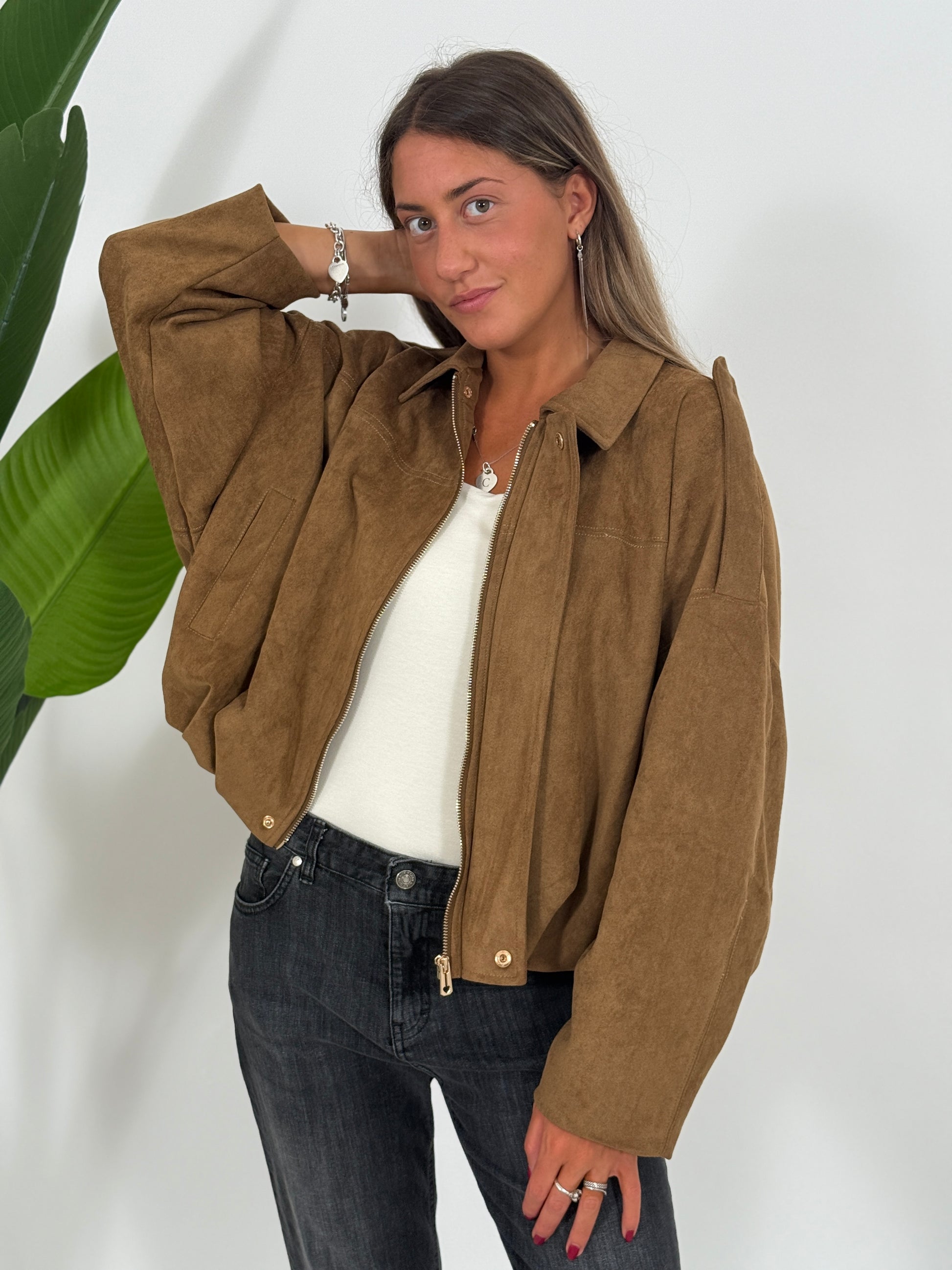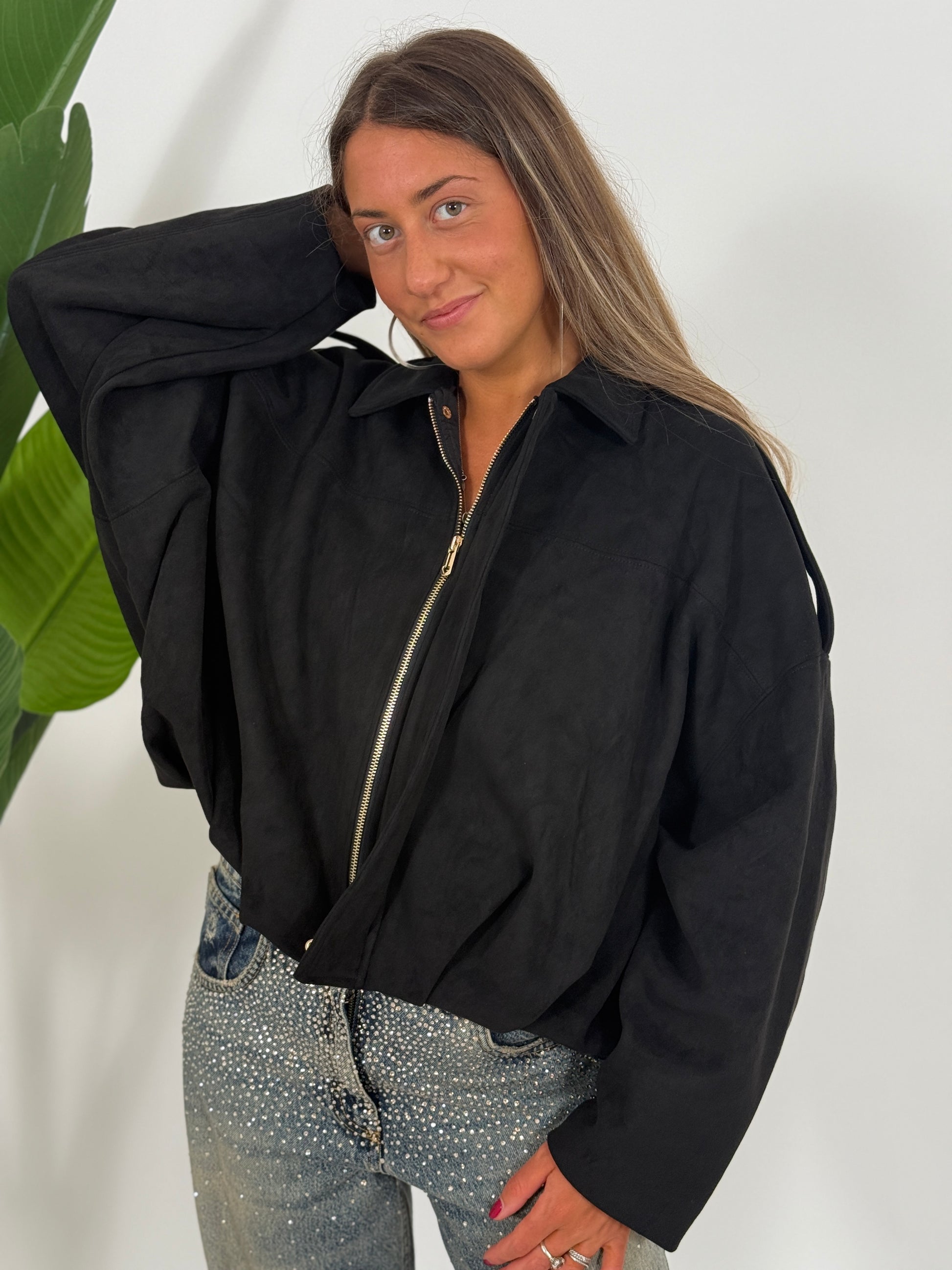 Bomber crop in ecodainetto con arriccio ed elastico sul fondo e maniche a pipistrello.