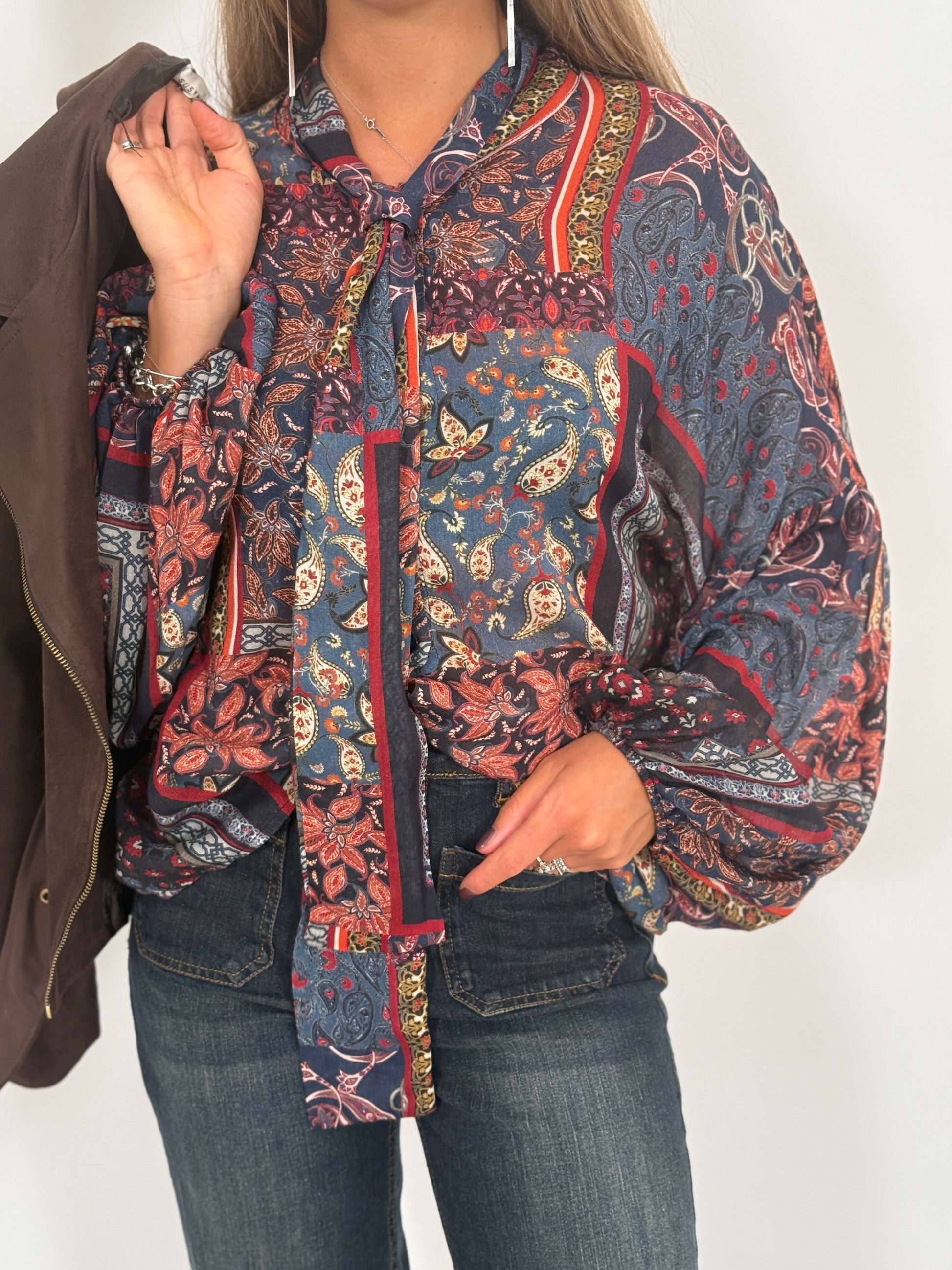 Camicia a fantasia con cravatta in tinta, manica palloncino.