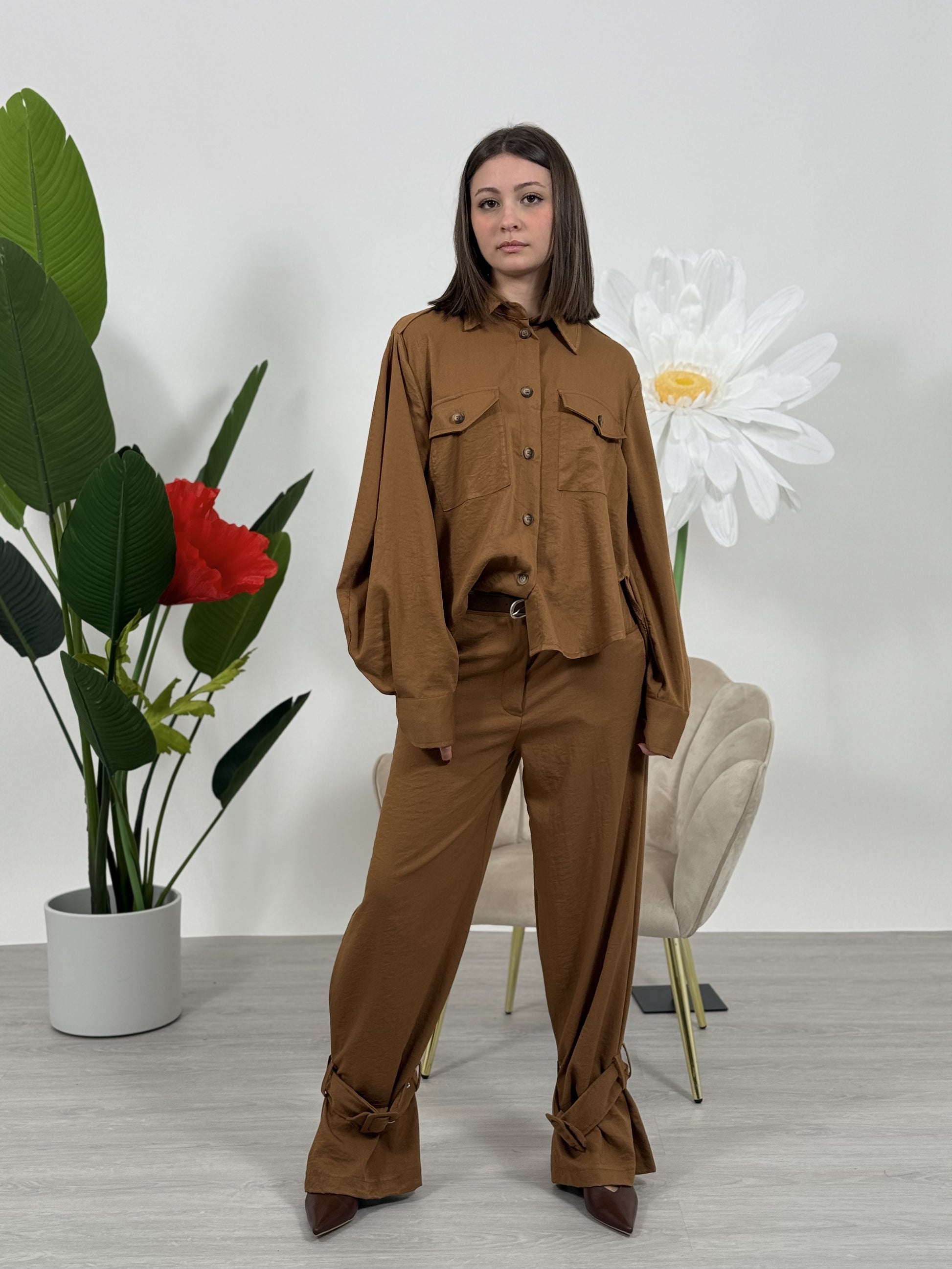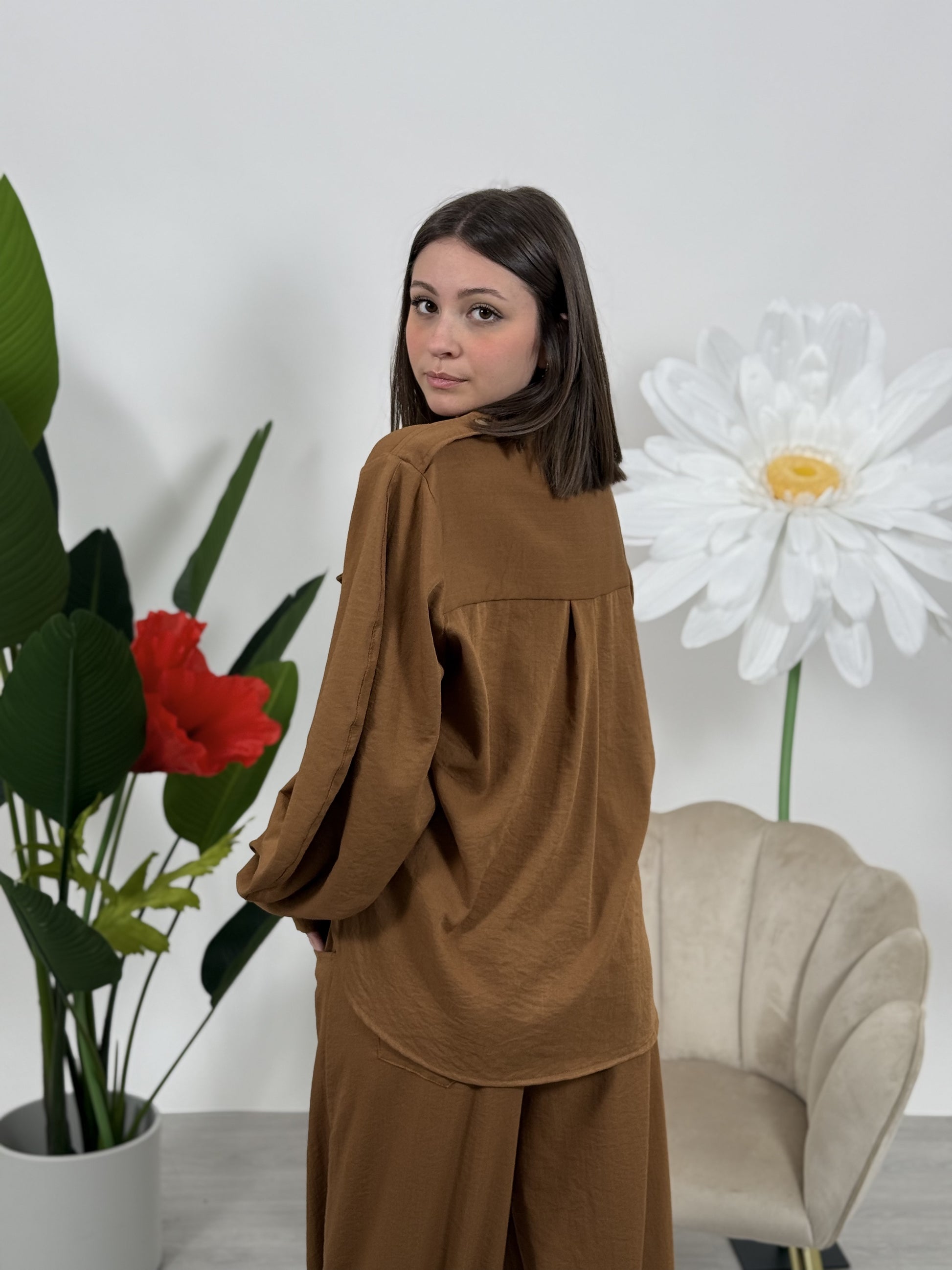 Camicia in viscosa color cannella tasconata con bottoni e colletto.