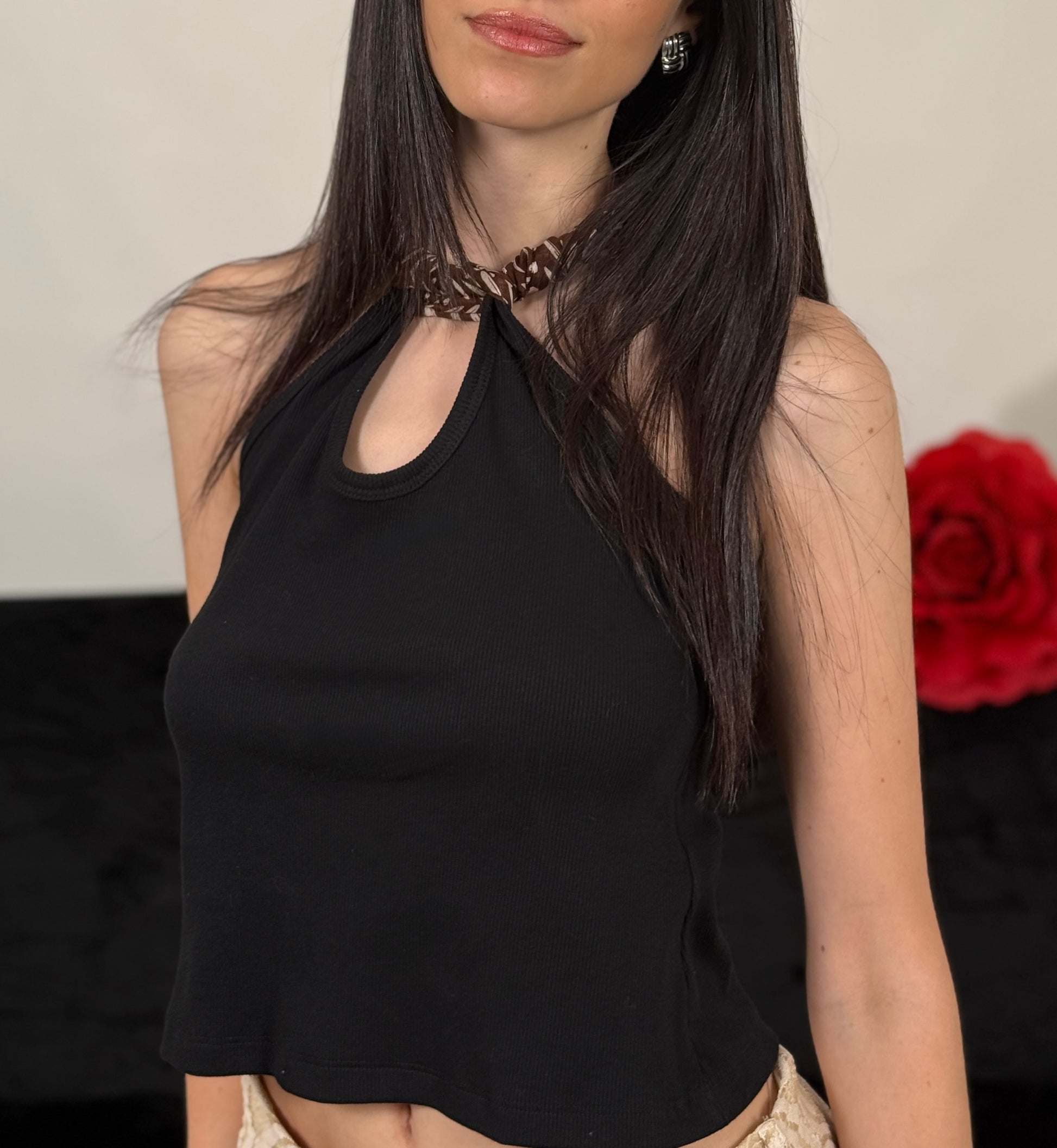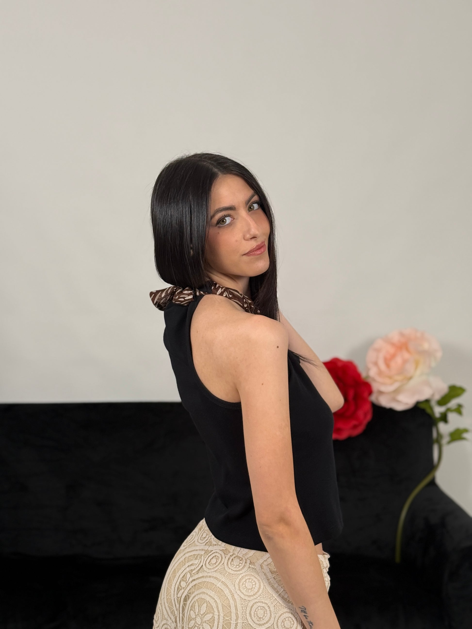 Canotta a costine con fusciacca misto seta giro spallina e nodo al collo. Elasticizzata