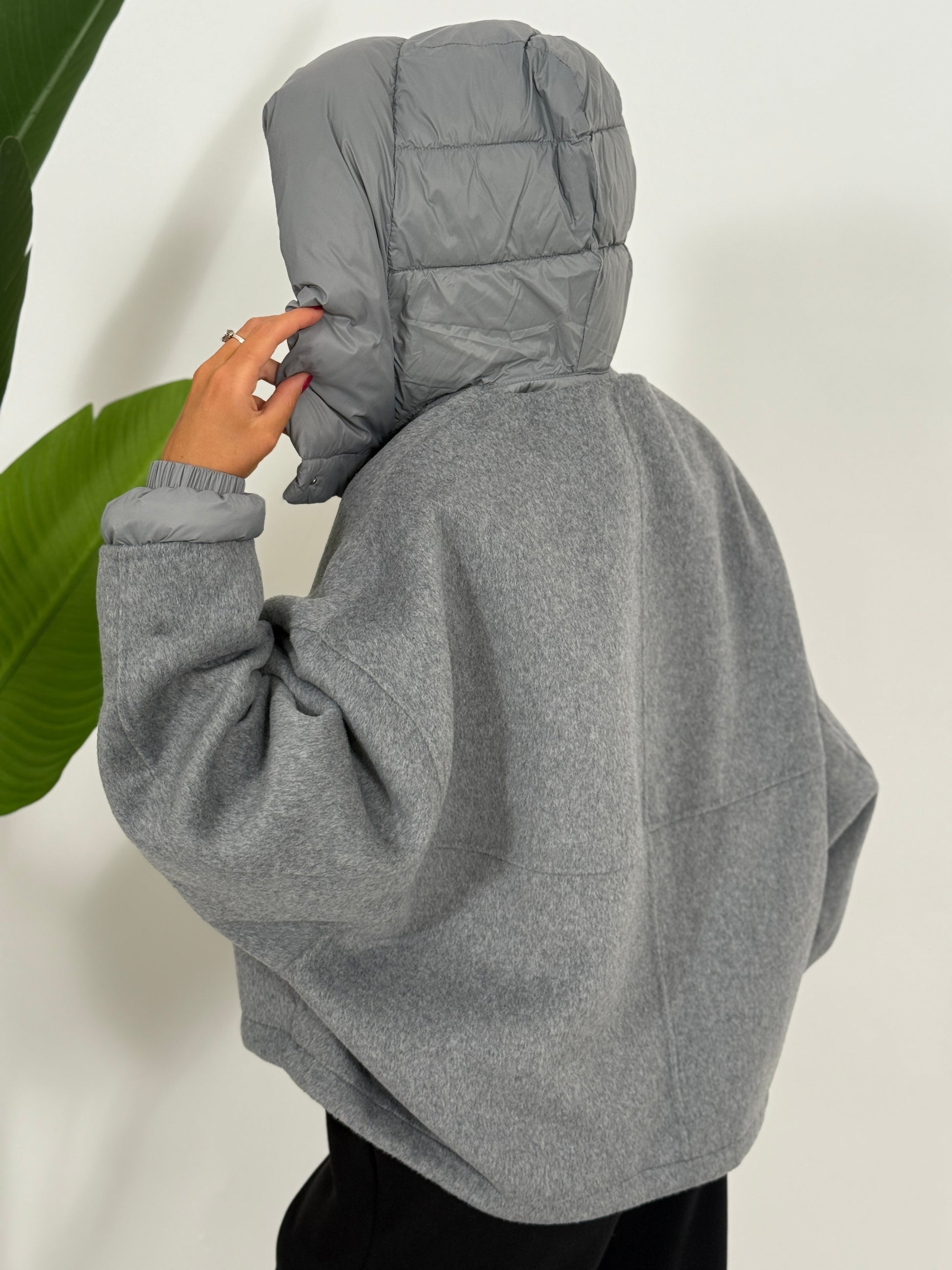 Cammpotto 50% lana a bomber con cappuccio e manica piumino, zip, bottoni e coulisse sul fondo.