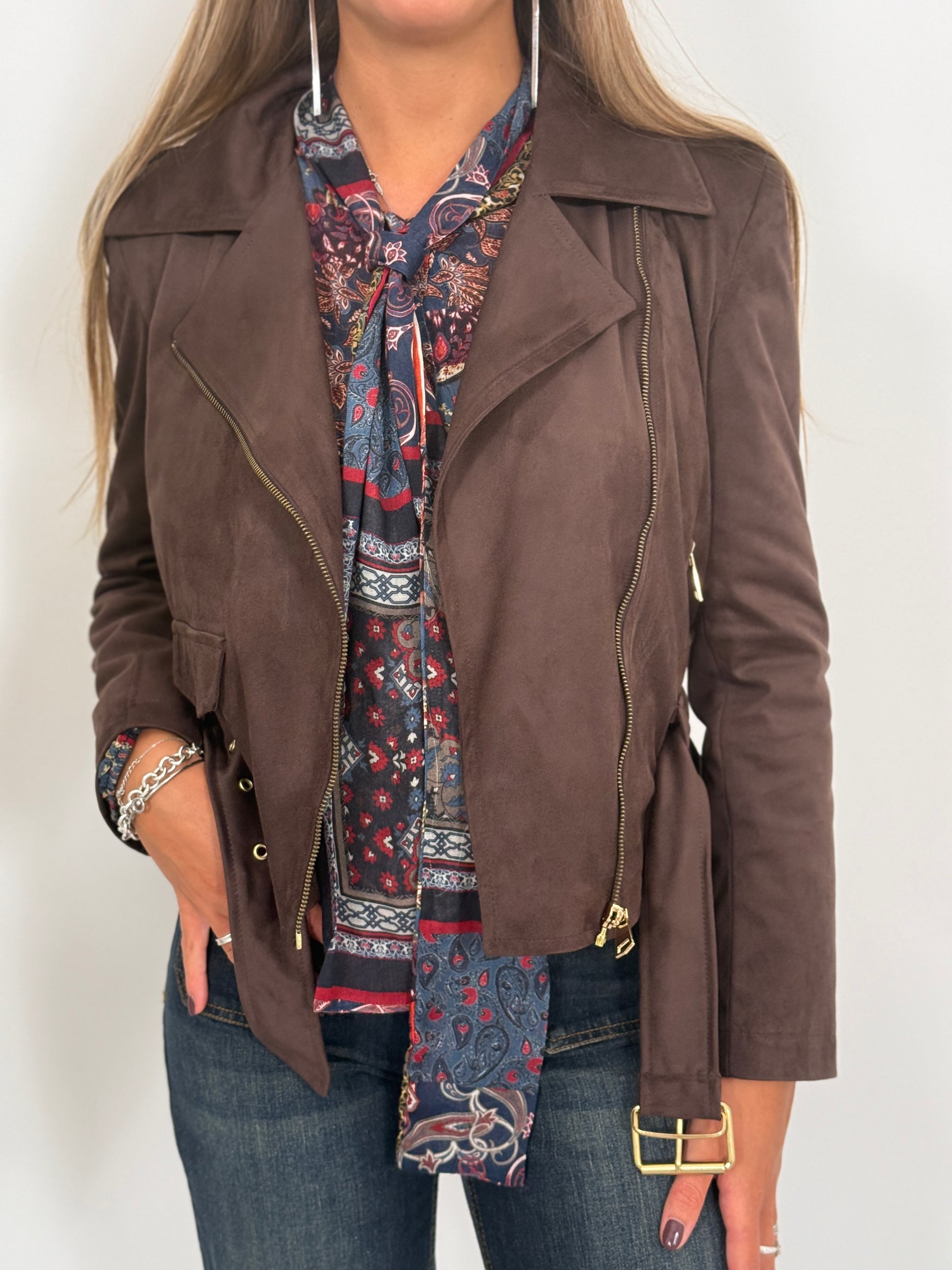Chiodo crop in suade con cintura, tasche laterali e collo rever