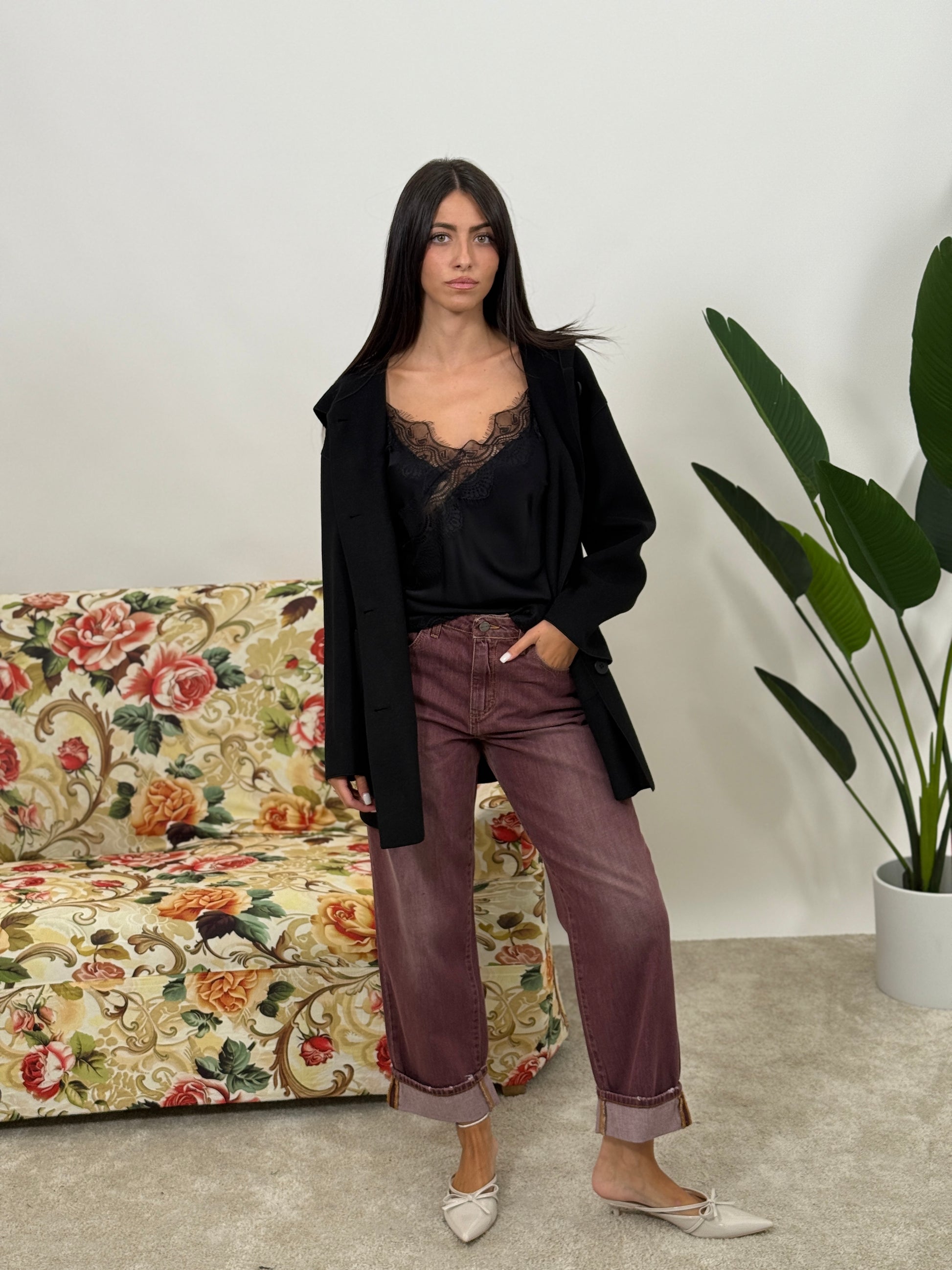 jeans gamba dritta bordeaux, lavaggio sporco, tessuto fermo.