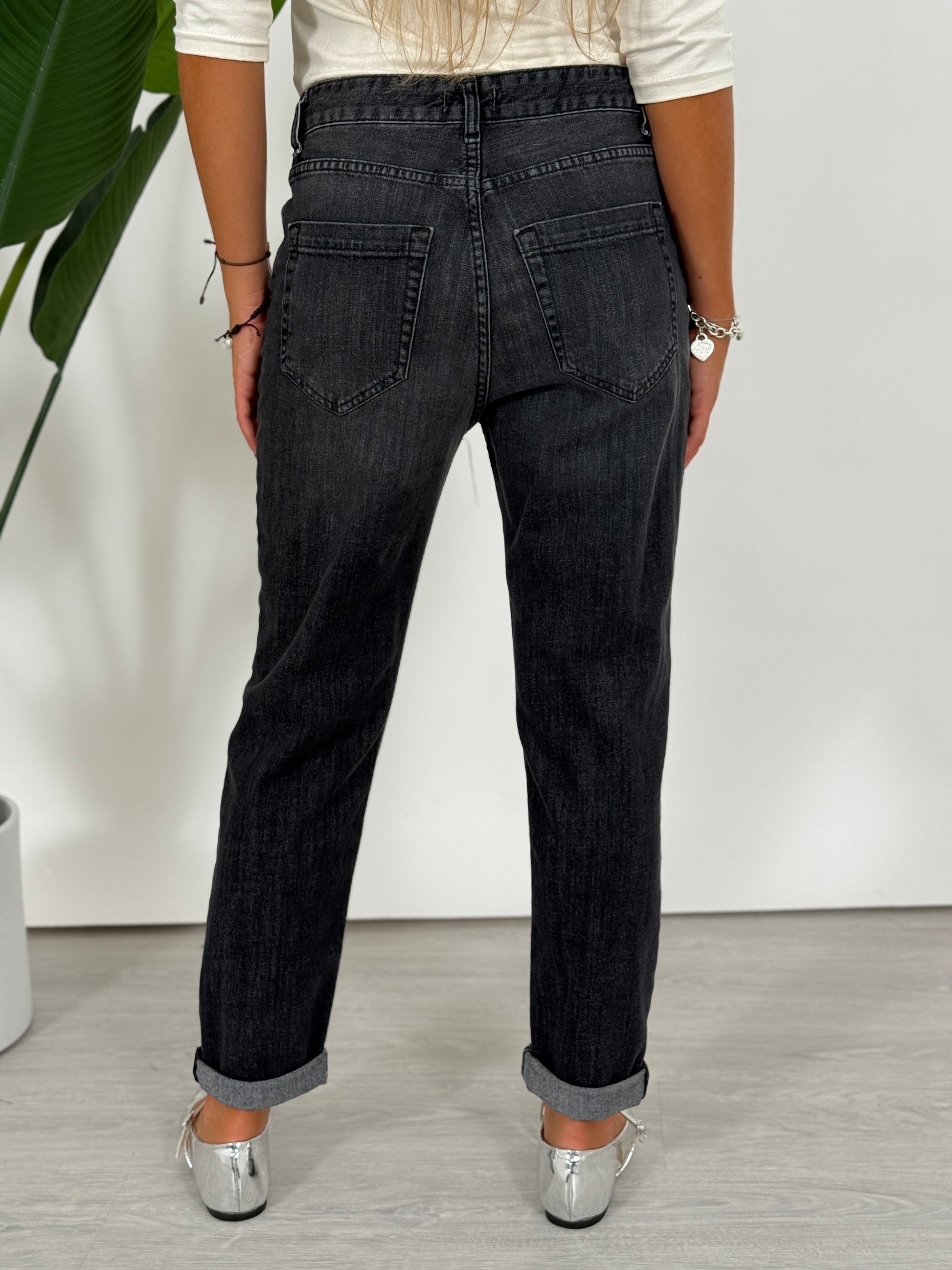 Denim 5 tasche grigio scuro, gamba dritta, elasticizzato con risvoltino.
