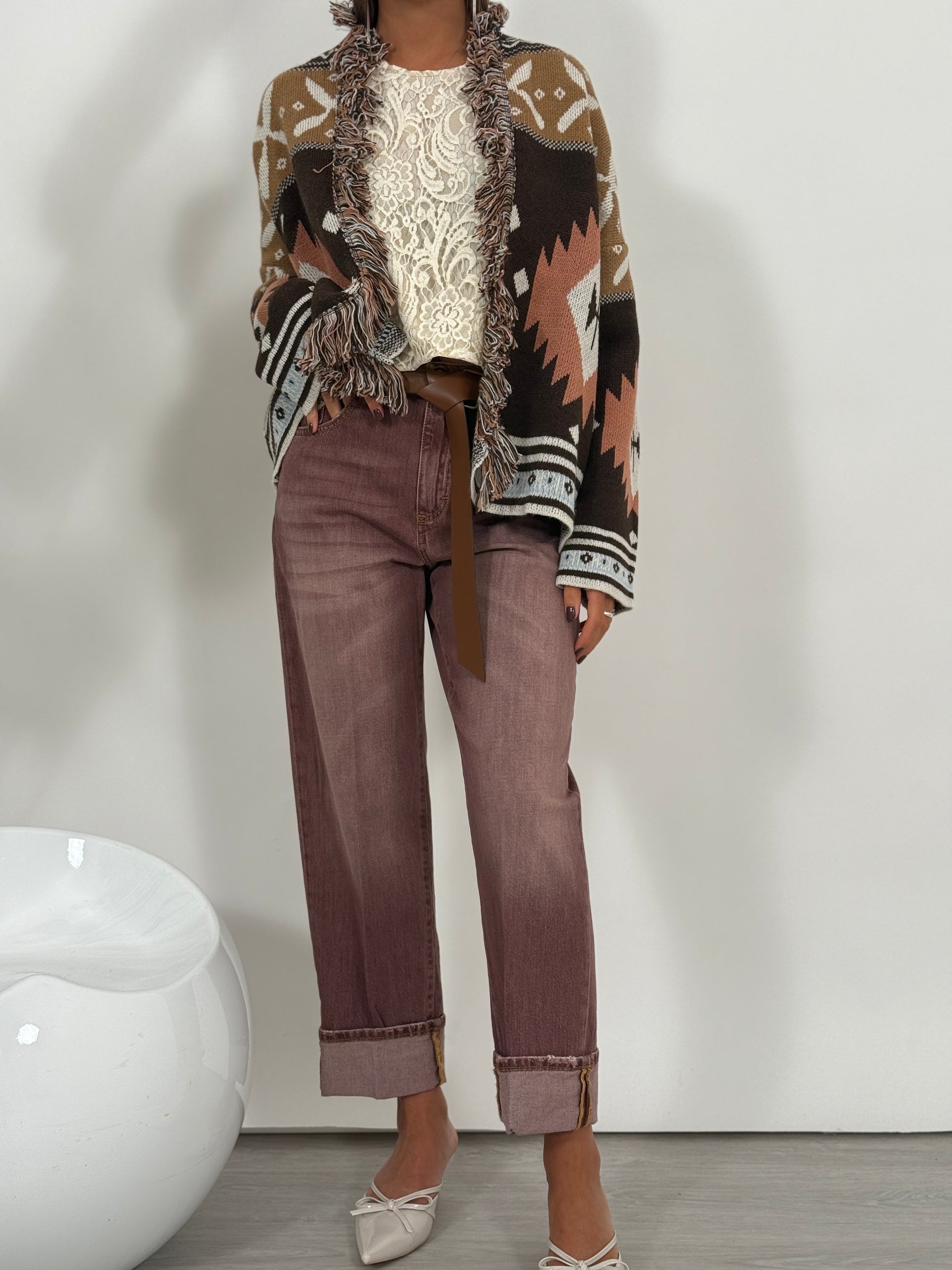 Jeans colorato effetto sporco gamba dritta con cintura regolabile e rovescio sul fondo.