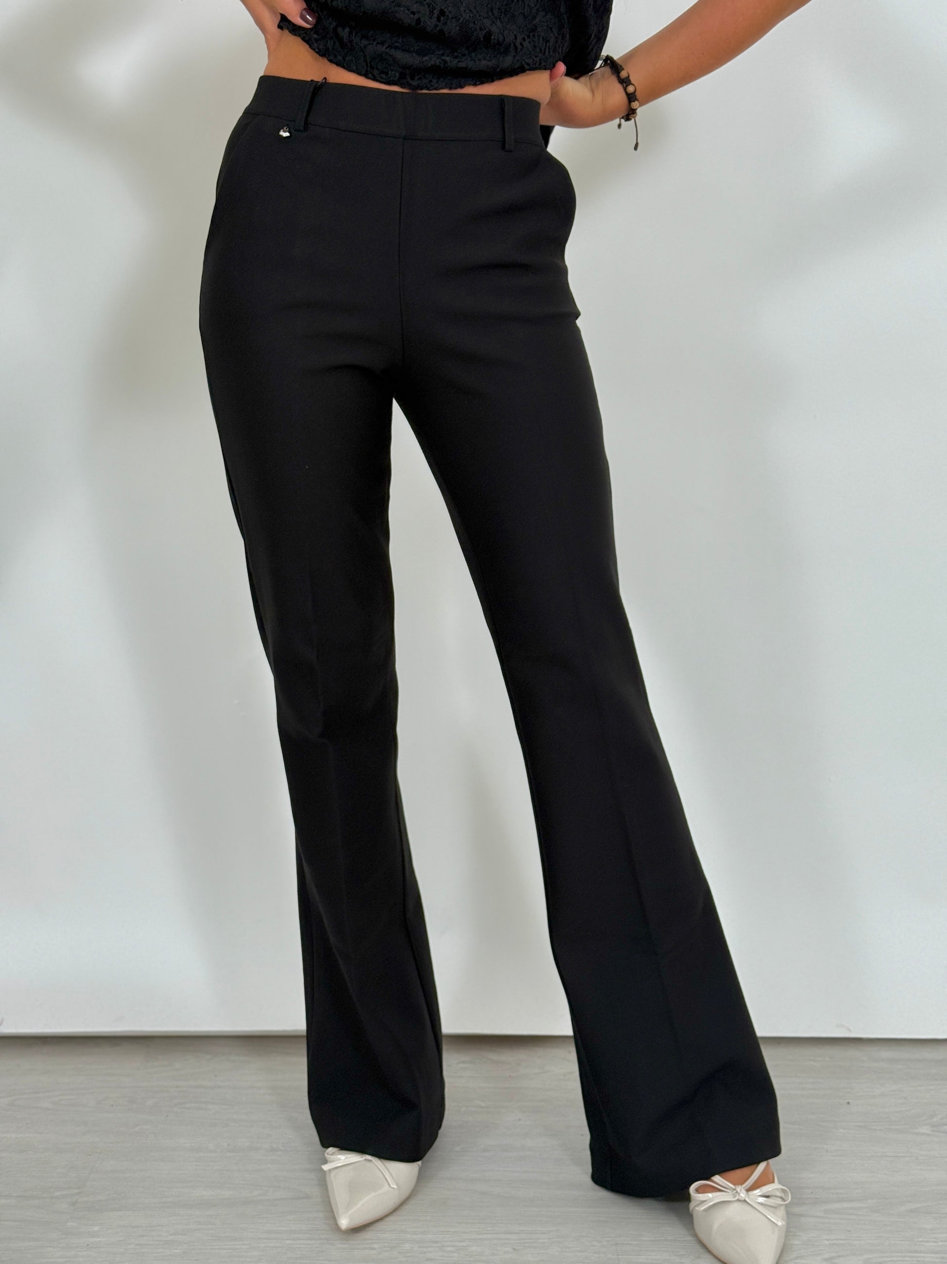 Pantalone in cotone punto milano con tasche scampanato, senza zip e bottoni con elastico in vita.