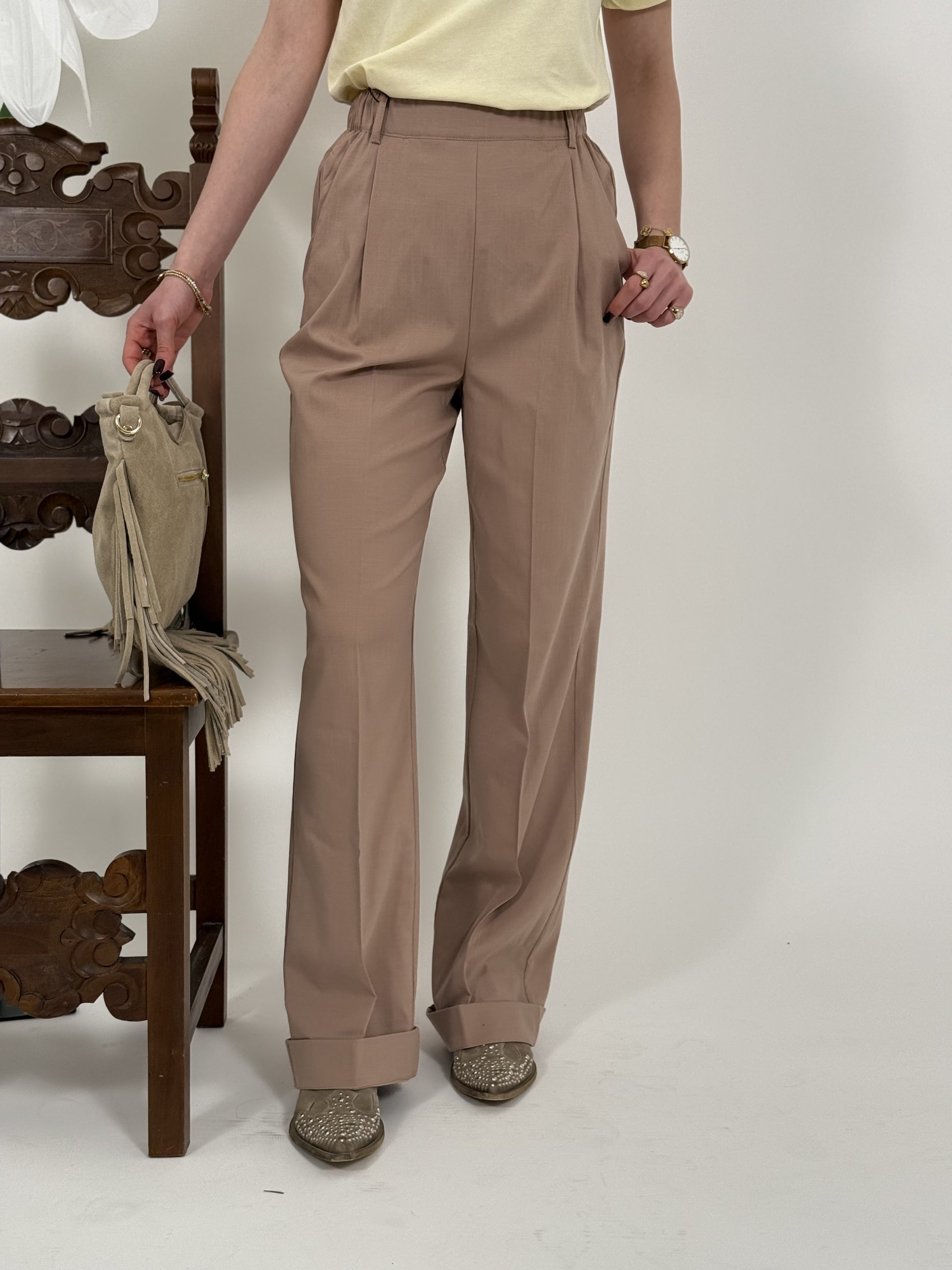 Pantalone ampio con tasche e pinces, risvoltato sul fondo con elastico in vita. Cotone naturale