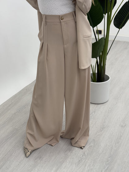 Pantalone fluido gamba ampia con pence, chiusura con bottone e zip, senza elastico.