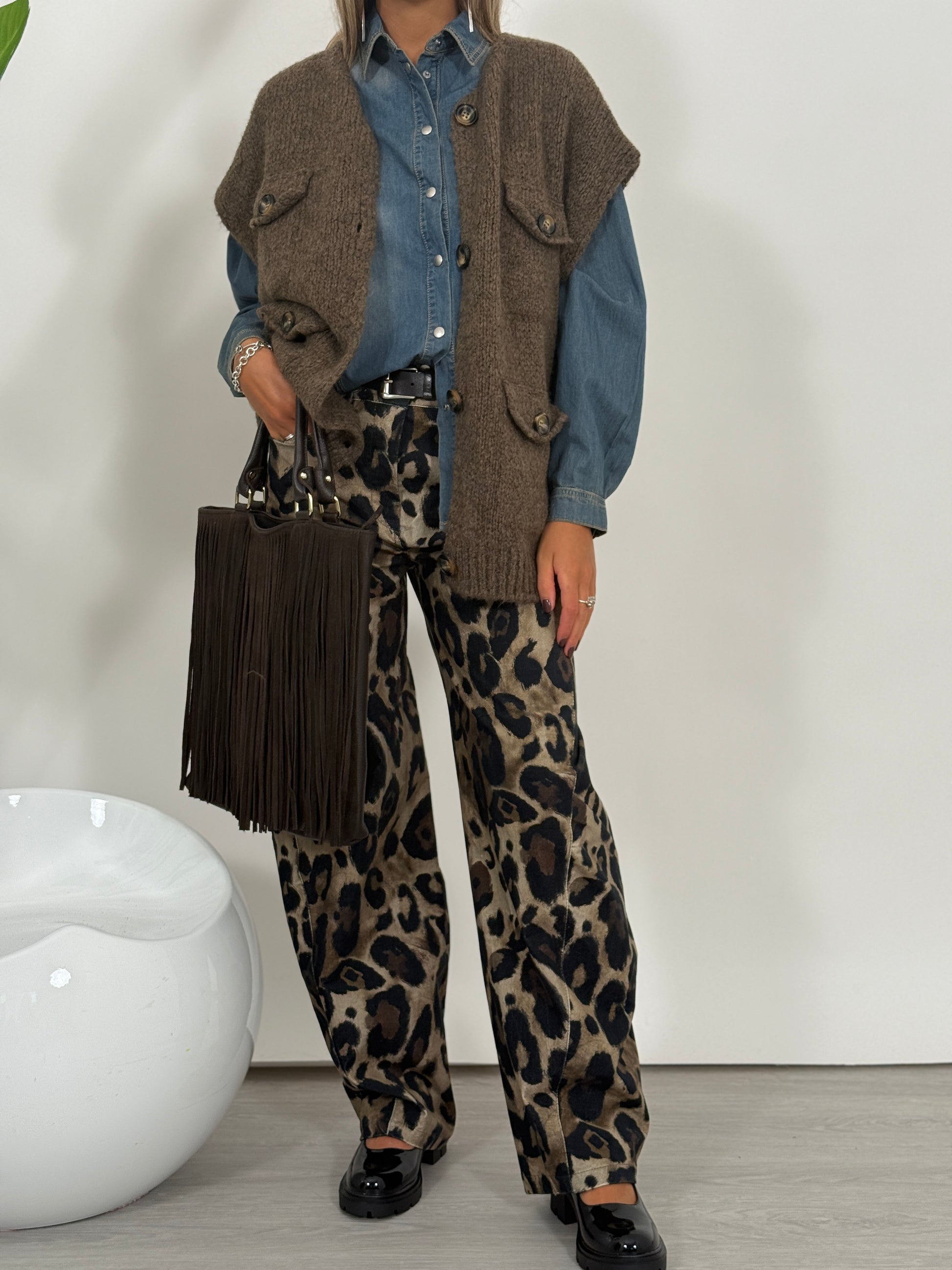 Pantalone maculato largo nella gamba, forma a banana con cintura regolabile in vita.