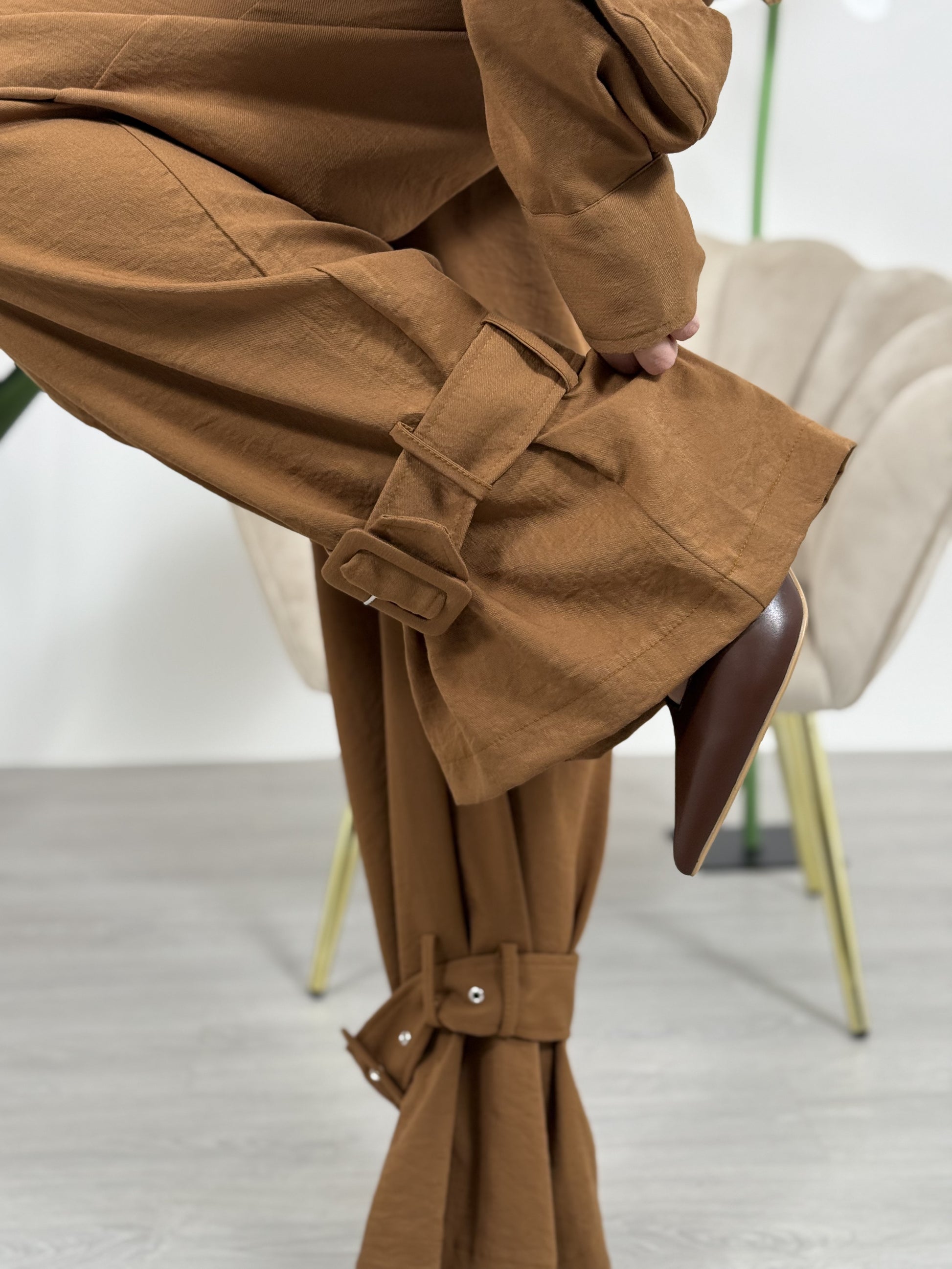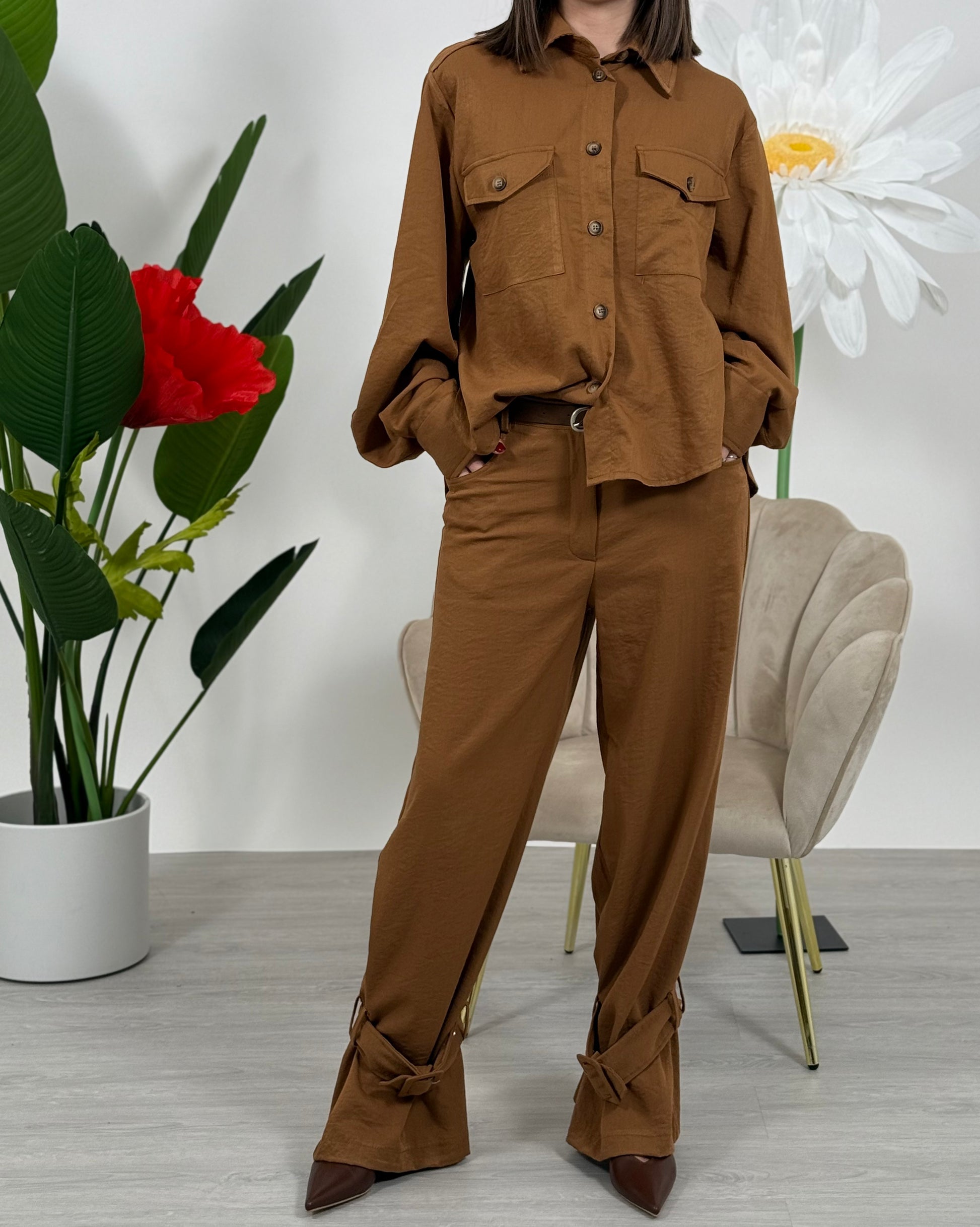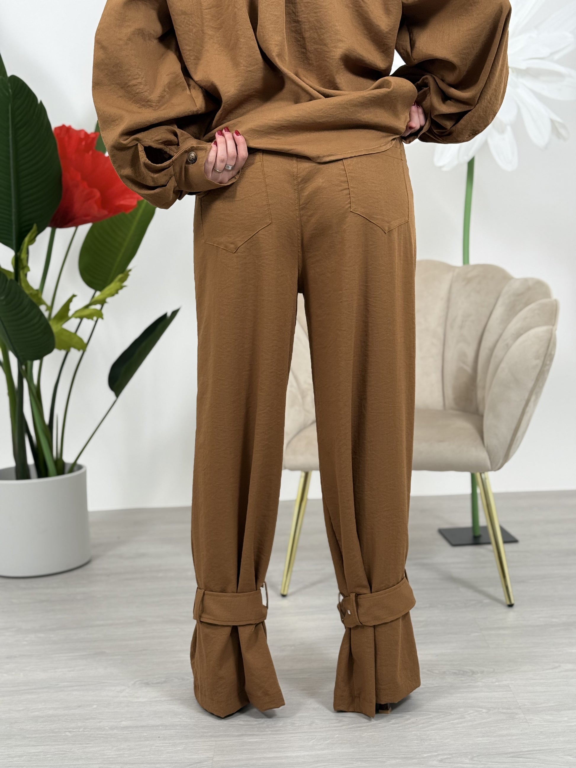 Pantalone fluido in viscosa con lacci sul fondo, chiusura con zip, bottone e cintura. Senza eòastico