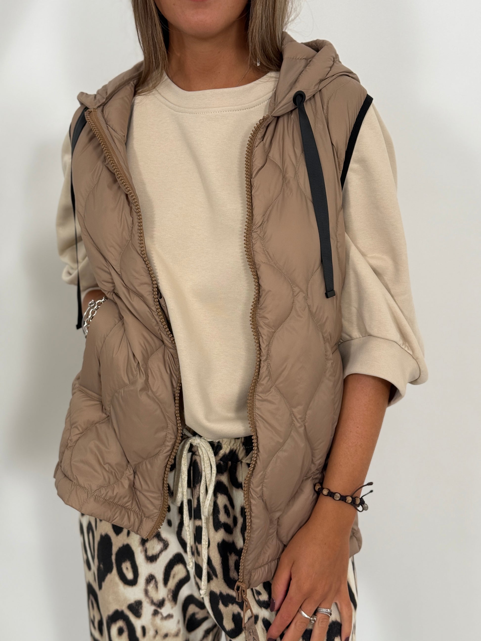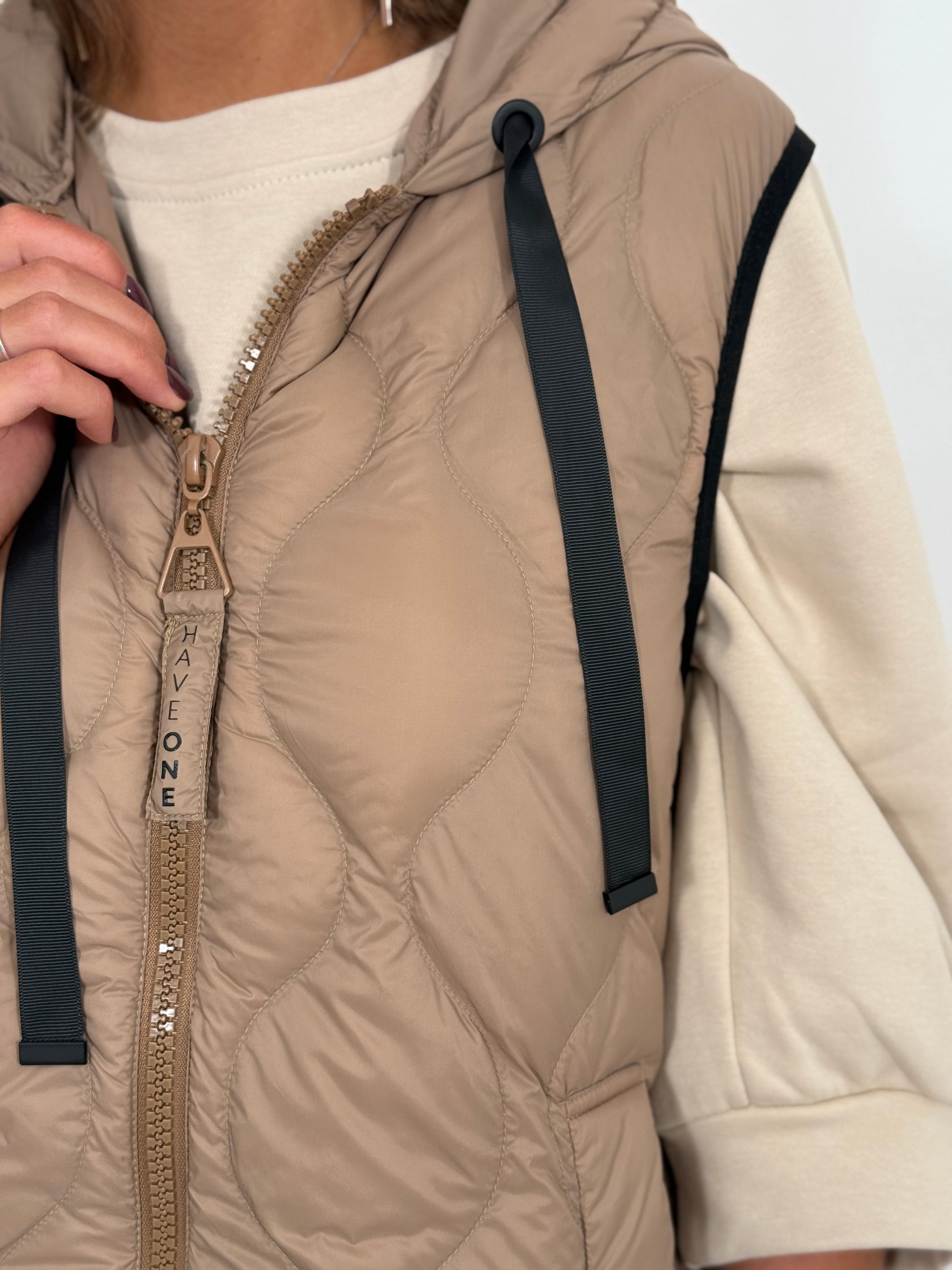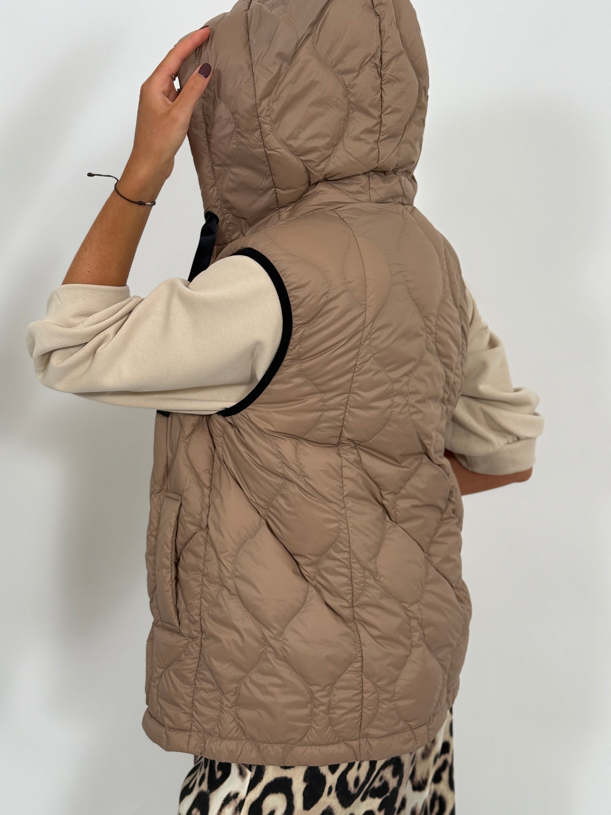 piumino smanicato in piuma d'oca con zip e cappuccio. Unisce l'eccellenza dell'isolamento termico con un design all'avanguardia.