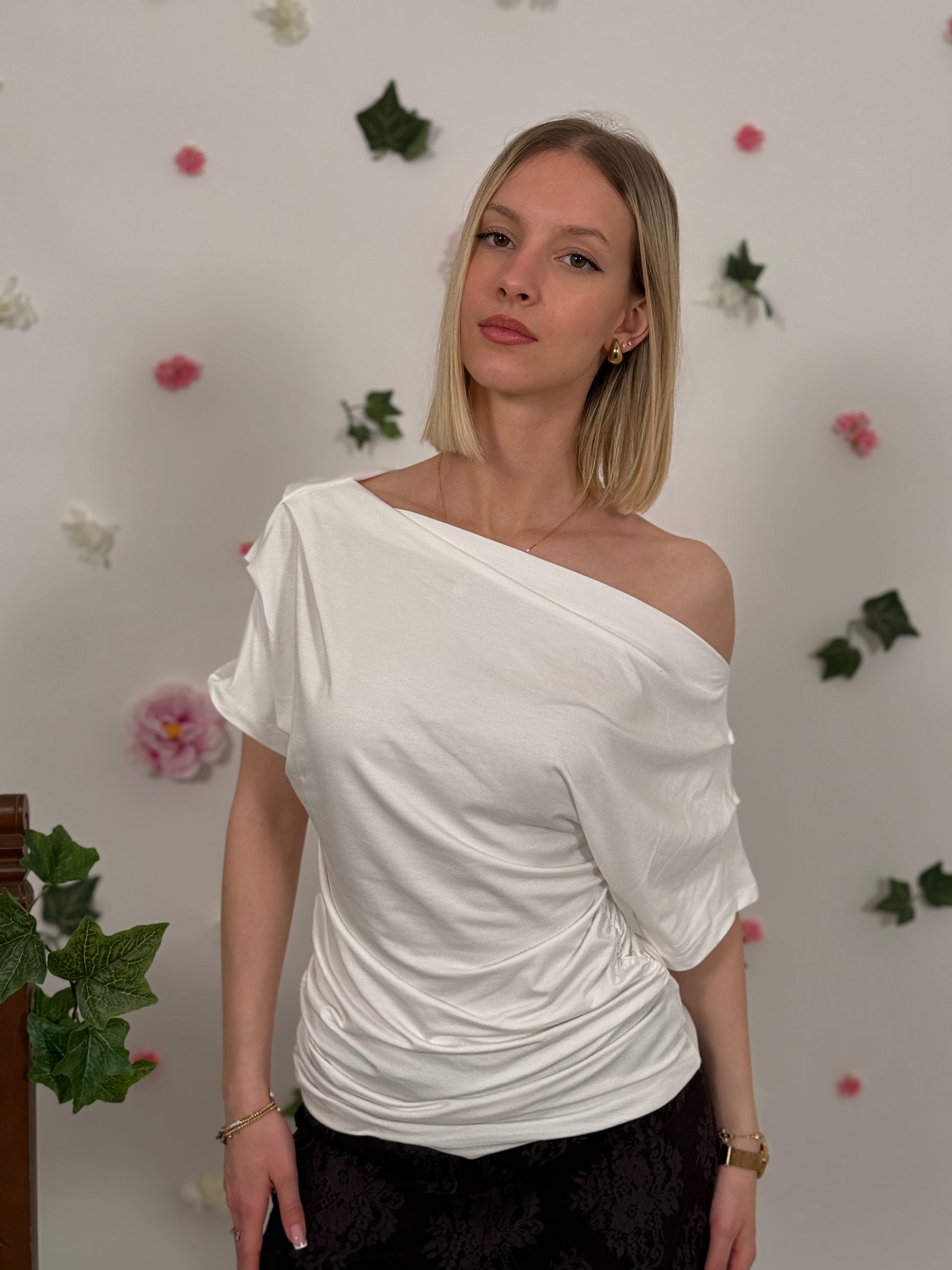 T-shirt con scollo a barca, drappeggiata sui lati.